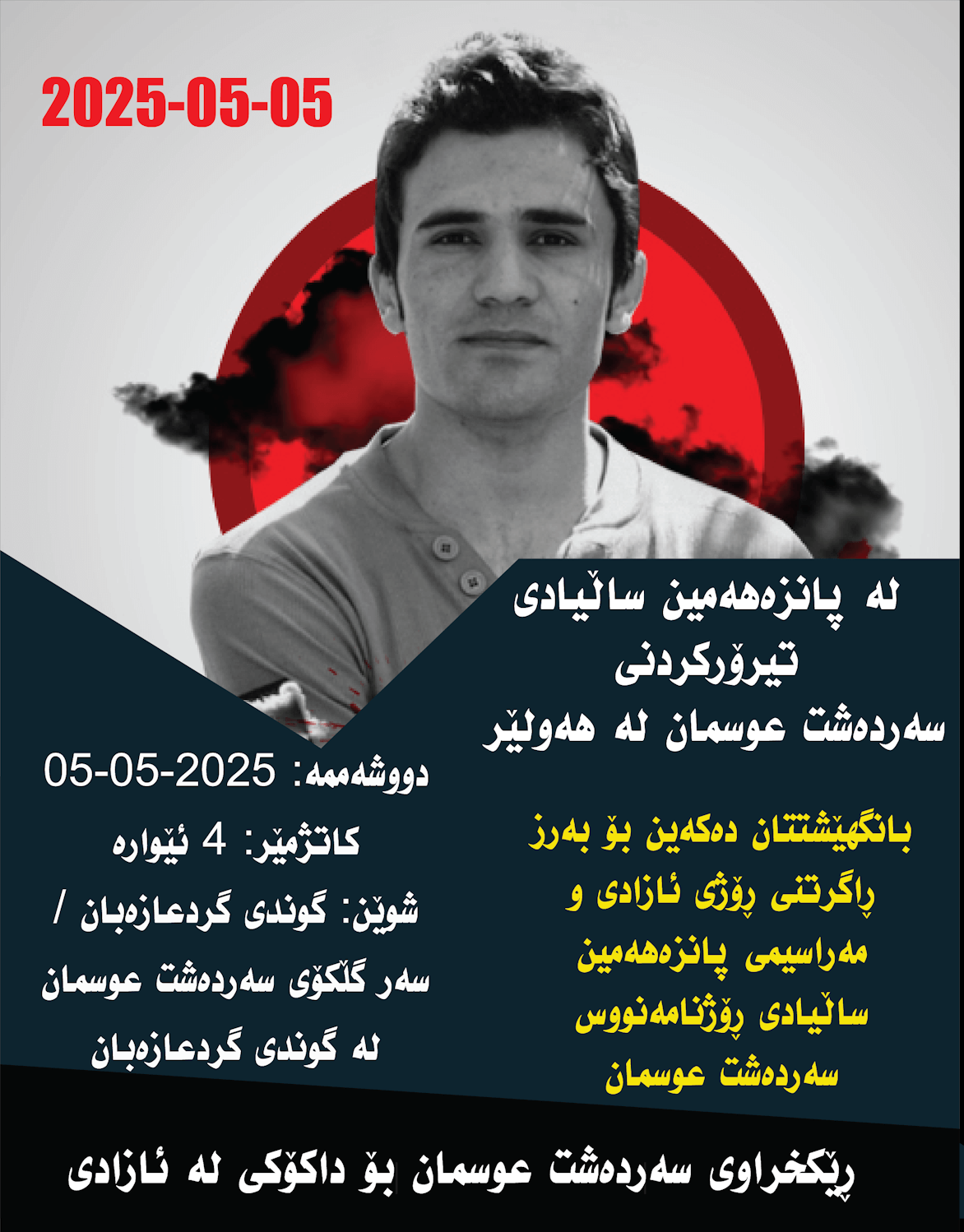 بانگهێشتتان دەکەین بۆ بەرز ڕاگرتنی ڕۆژی ئازادی و مەراسیمی پانزەهەمین ساڵیادی ڕۆژنامەنووس سەردەشت عوسمان.