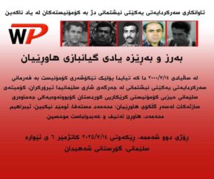 لە ساڵیادی ٢٠٠٠/٧/١٤ دا کە تیایدا پۆلێک تێکۆشەری کۆمۆنیست بە فەرمانی سەرکردایەتی یەکێتی نیشتمانی لە جەرگەی شاری سلێمانیدا تیرۆرکران، کۆمیتەی سلێمانی حیزبی کۆمۆنیستی کرێکاریی کوردستان کۆبوونەوەیەکی جەماوەری سازئەکات لەسەر گڵکۆی هاوڕێیان: محەمەد مستەفا، ئومێد نیکبین، ئیبراهیم محەمەد، هاوڕێ لەتیف و عەبدولباست موحسین.
