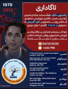 ڕێکخراوی داکۆک لە ڕێکەوتی ٢٠٢٥/١٢/٥ لە درێژەی کار و چالاکیەکانیدا هەڵدەستێت بە بەرز ڕاگرتنی ١٢ هەمین ساڵیادی شەهیدی قەڵەم ڕۆژنامەنووس (کاوە گەرمیانی) لە وڵاتی بەریتانیا لە حەوت شاری جیاواز کاتژمێر ١ی دوانیوەڕۆ.