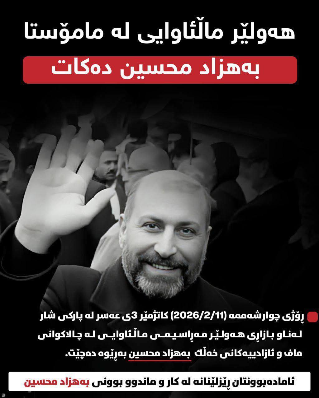 مەراسیمی ماڵئاوایی لە مامۆستای زانكۆ و نوسەر و روناكبیر و چالاكوانی ماف و ئازادییەكانی خەڵك مامۆستا (بەهزاد موحسین) بەڕێوە دەچێت.